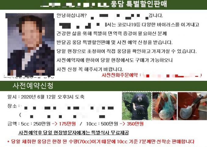반달가슴곰 한 마리로부터 얻을 수 있는 웅담은 70cc다. 웅담 판매 관련 광고글에 따르면 웅담 5cc는 175만 원에 판매된다. 한 마리당 2450만 원의 수익을 올릴 수 있다는 것이다.
