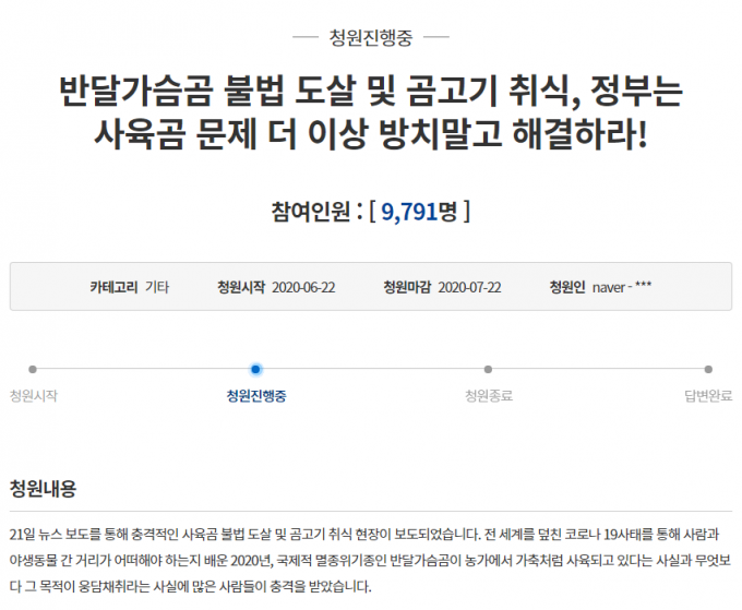 동물자유연대 "정부가 나서서 보호시설 마련해야" 코로나19 예방에 도움이 된다며 반달가슴곰의 웅담을 판매한 농가가 최근 적발됐다. 웅담을 채취하고 판매해서가 아니었다. 웅담이 아닌 다른 부위를 취식했다는 이유에서였다. 도축 방식에서도 불법 소지가 있었다. 한국에서는 국제 멸종위기종인 반달가슴곰의 웅담을 채취하고 먹는 것이 가능하다.