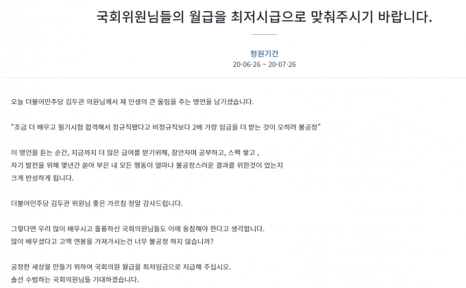 '국회의원 월급 최저시급'을 주장하는 청원은 2018년에도 홈페이지에 올라온 바 있다. 이 청원은 당시 20만 명 이상의 동의를 받았다.
