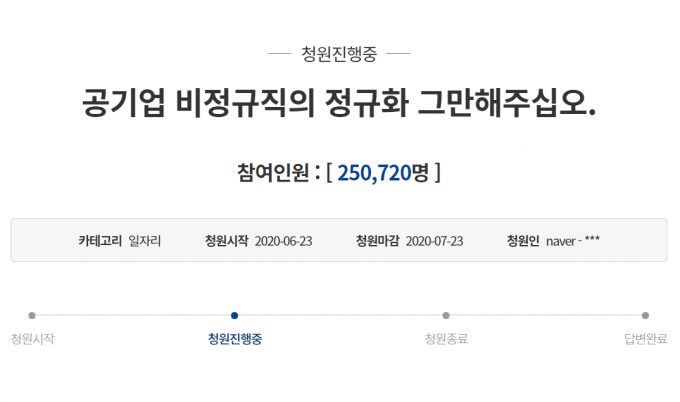 지난 23일 청와대 국민청원에는 '공기업 비정규직의 정규화 그만해주십시오'라는 제목의 청원이 올라왔다. 청원인은 청원글을 통해 "인국공 (비정규직의 정규직)전환은 정말 충격적"이라며 "정직원 수보다 많은 이들이 정규직 전환이 된다니요"라고 지적했다.