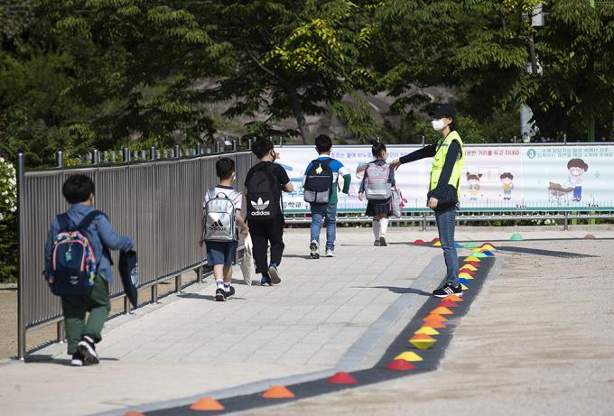 ▲ 고등학교 2학년과 중학교 3학년, 초등학교 1∼2학년, 유치원생들의 등교 개학이 시작된 5월 27일 오전 서울 성북구 월곡초등학교에서 초등학교 학생들이 거리를 두고 교내로 들어가고 있다. 해당 사진은 기사 내용과 무관함. [정병혁 기자]