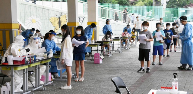 ▲ 왕성교회 코로나19 집단감염 관련 확진자 중 한 명이 난우초등학교 시간강사로 밝혀진 가운데 28일 오전 서울 관악구 난우초등학교에 마련된 이동 선별진료소에서 학생들이 진료를 받기 위해 대기하고 있다. [뉴시스]