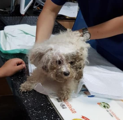 ▲ 구조된 강아지의 모습. 털이 지저분하고 엉켜있다. [케어 페이스북 캡처]