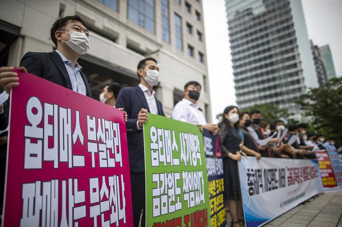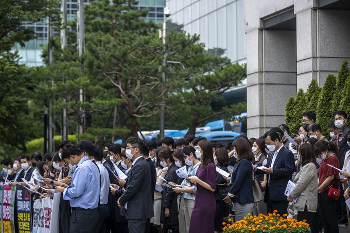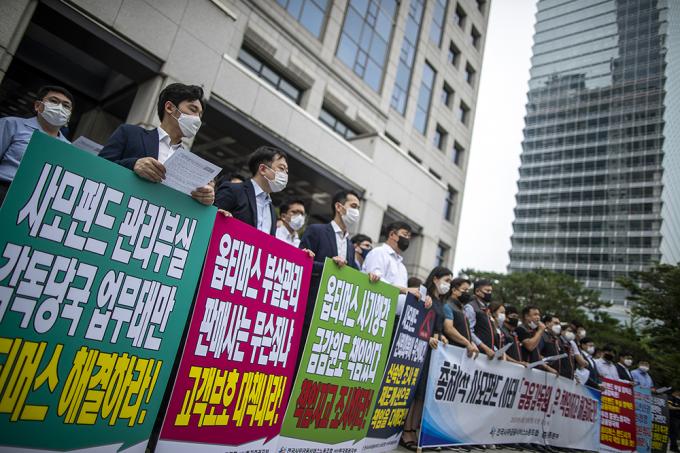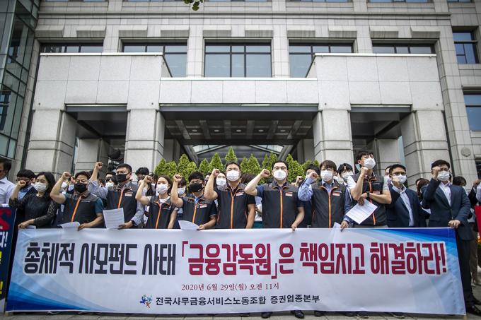 29일 전국사무금융서비스노동조합 증권업종본부 조합원들이 여의도 금융감독원 앞에서 옵티머스 사모펀드 상황 불능 사태 금융감독원이 관리, 감독 책임지고 해결 촉구를 요구하며 기자회견을 열었다. 이들은 "지난해 라임펀드 사태가 잊히기도 전에 또 다시 사모펀드 사기 사건이 발생했다"며 "이러한 사기펀드 사건이 연쇄적으로 발생하는 데에는 금융 사고를 예방하고 관리, 감독해야하는 금융감독원의 책임이 엄중하다"고 비판했다.