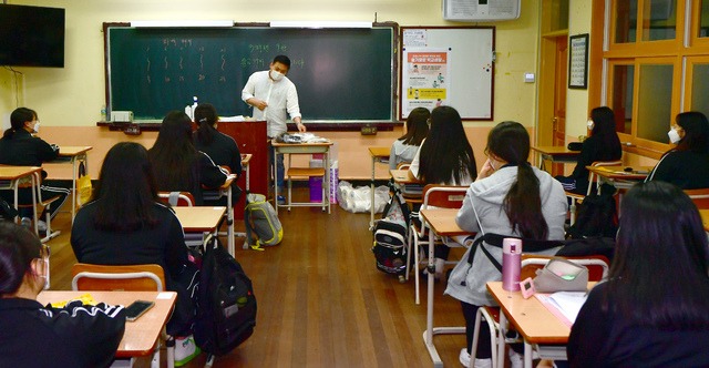 ▲ 지난달 20일 오전 광주 한 고등학교 3학년 교실에서 교사가 마스크를 착용한 채 조회를 하고 있다. 해당 사진은 기사와 관련 없음. [뉴시스]