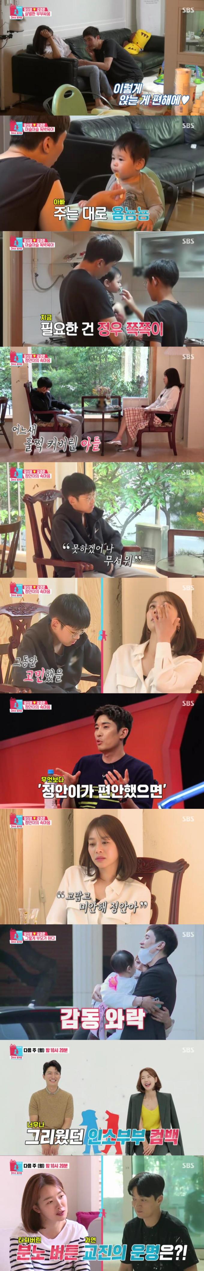 장신영은 첫째 강정안을 불러 오랜만에 이야기를 나눴다. 사춘기인 아들에게 궁금했던 것을 물어보던 장신영은 그동안 알지 못했던 강정안의 마음을 듣고 눈물을 보였다. 어릴 때는 강경준을 삼촌이라고 부르며 잘 따르던 강정안은 "('삼촌'이라고) 못 하겠다. 무섭다. (이유는) 모른다"고 밝혔다.