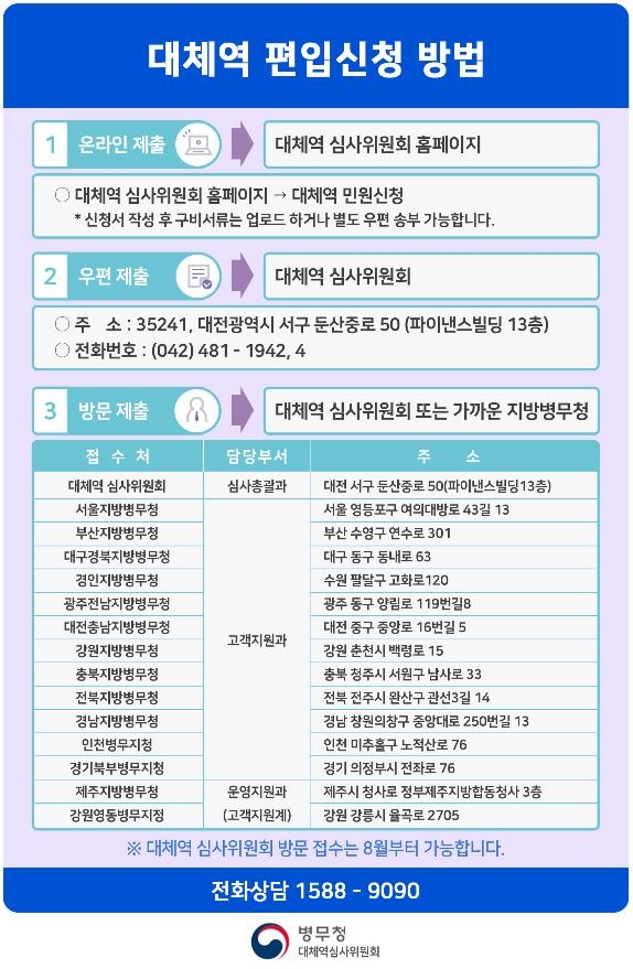 대체역 심사위원회 및 각 지방병무청에서 신청 가능