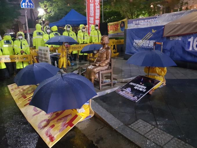 지난 24일 정의기억연대는 제1445차 정기 수요시위를 옛 주한 일본대사관 정문 앞 소녀상에서 약 10여m 떨어진 연합뉴스 사옥 근처에서 열었다. 자유연대가 같은 장소에 선순위로 집회를 신고함에 따라 1992년 이후 28년간 지켜온 자리를 불가피하게 옮길 수밖에 없었다.
