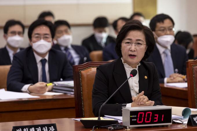 추 장관은 1일 국회 법제사법위원회 전체 회의에 출석해 "검찰총장은 수장으로서 바로 공정성 우려 때문에 6월 4일자에 손을 떼겠다고 지시 공문을 내려놓고 그 후에 오히려 그와 반대되는 결정을 자꾸 해서 왜 이렇게 혼란스러운가 저도 상당히 우려하고 있다"며 이같이 밝혔다.
