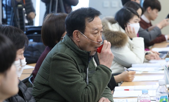 ▲ 지난 2월18일 오전 서울 중구 포스트타워 가습기살균제사건 특별조사위원회 대회의실에서 열린 가습기 살균제 피해 가정 대상 첫 조사결과 발표에서 피해자 서영철 씨가 발언을 마친 뒤 흡입기를 사용하고 있다. 서 씨는 피해 이후 폐 기능이 일반인의 21%정도밖에 되지 않는다고 발언했다. [뉴시스]