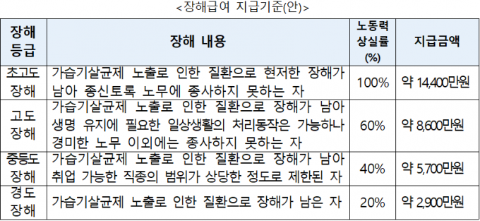 이 밖에 특히 피해지원 유효기간이 만료되는 피해자에게는 남은 장해 정도에 따라 장해급여를 일시금으로 지급하도록 했다. 노동능력 상실 정도에 따라 장해등급을 4단계로 구분해 △ 초고도장해 약 1억 4400만 원 △ 고도장해 약 8600만 원 △중등도장해 약 5700만 원 △경도장해약 2900만 원을 지급할 예정이다.