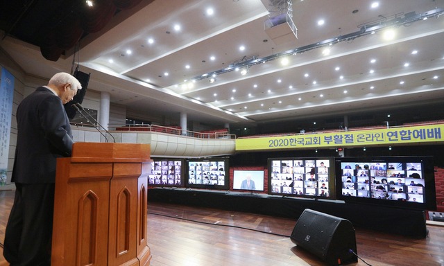 ▲ 박옥수 목사가 지난 4월 12일 서울 서초구 기쁜소식선교회에서 비대면 원격 예배 방식으로 열린 2020 한국교회 부활절 온라인 연합예배에서 기도하고 있다. [한국기독교연합 제공]