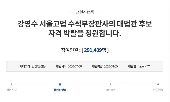 7일 청와대 국민청원 게시판에 따르면 이날 오전 9시 기준 '강영수 서울고법 수석부장판사의 대법관 후보 자격 박탈을 청원합니다'라는 제목의 청원은 29만1409명의 동의를 받았다.