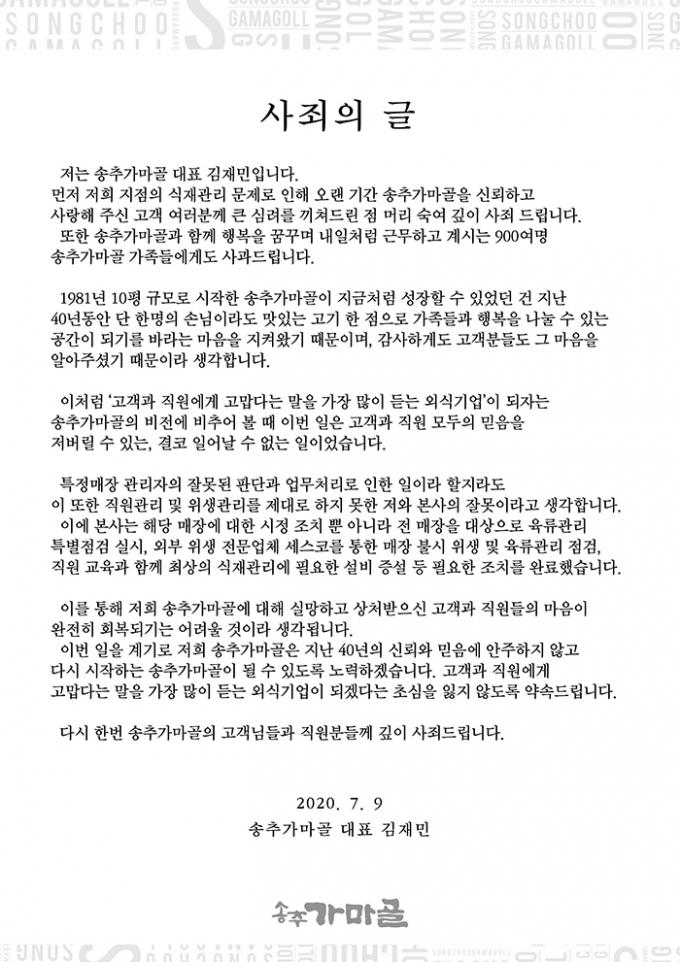 김재민 송추가마골 대표는 9일 공식 웹사이트에 "저희 지점의 식재관리 문제로 인해 오랜 기간 송추가마골을 신뢰하고 사랑해 주신 고객 여러분께 큰 심려를 끼쳐드린 점 머리 숙여 깊이 사죄드린다"는 글을 게재했다.