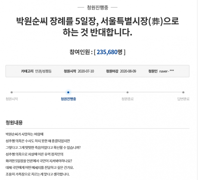 청원인은 "박원순씨가 사망하는 바람에 성추행 의혹은 수사도 하지 못한 채 종결되었다. 그렇다고 그게 떳떳한 죽음이었다고 확신할 수 있는가"라며 "성추행 의혹으로 자살에 이른 유력 정치인의 화려한 5일장을 국민이 지켜봐야하는가. 조용히 가족장으로 치르는게 맞다"고 글을 썼다.