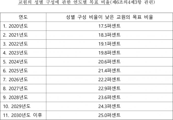 이에 따라 교육부는 이번 교육공무원임용령 개정으로 교원의 성별 구성에 관한 연도별 목표 비율을 구체적으로 정했다.