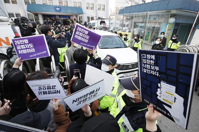 ▲ 지난 3월 25일 인터넷 메신저 텔레그램에서 미성년자를 포함한 여성들의 성 착취물을 제작 및 유포한 혐의를 받는 '박사방' 운영자 조주빈(25)이 탄 차량이 서울 종로경찰서를 나와 검찰 유치장으로 향하자 시민들이 조주빈의 강력처벌을 촉구하며 피켓시위를 하고 있다.[정병혁 기자]