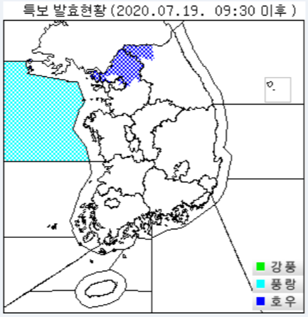 기상청은 19일 오전 9시 30분 기준으로 인천(강화), 서울(동북권), 강원도(화천, 철원), 서해5도, 경기도(가평, 하남, 남양주, 구리, 파주, 의정부, 양주, 포천, 연천, 동두천, 김포)에 호우주의보를 발효했다.