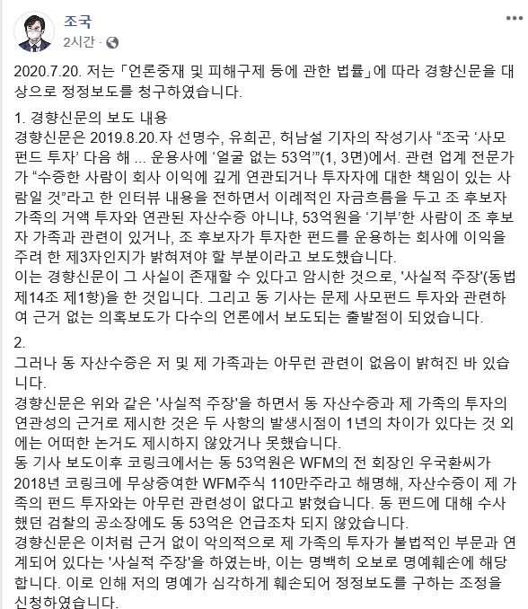 조 전 장관은 20일 자신의 소셜미디어(SNS)에 글을 올려 "언론중재 및 피해구제 등에 관한 법률에 따라 경향신문을 대상으로 정정보도를 청구했다"고 밝혔다.