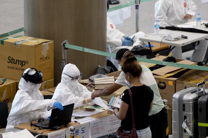 ▲ 지난 14일 인천국제공항 제1여객터미널에서 입국한 승객들이 방역당국의 안내를 받고 있다. [문재원 기자]