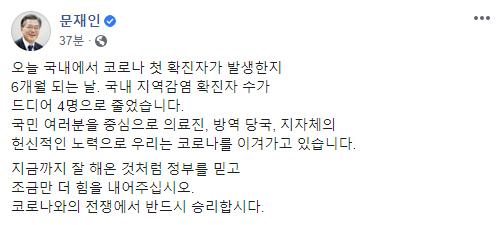 문 대통령은 20일 공식 SNS를 통해 "국내에서 코로나 첫 확진자가 발생한 지 6개월 되는 날 국내 지역감염 확진자 수가 드디어 4명으로 줄었다"고 말했다.