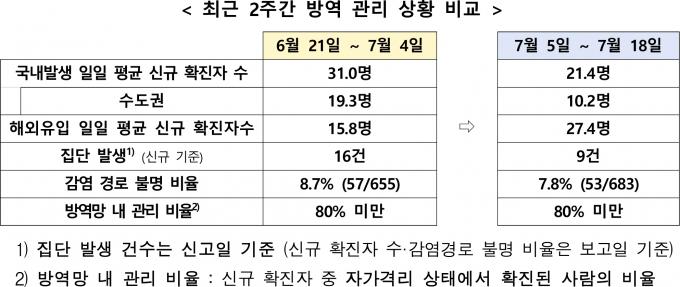 중앙재난안전대책본부는 지난달 21일부터 이달 4일까지 2주간과 이달 5일부터 18일까지 2주간 방역관리 상황을 비교한 결과 국내발생 신규 확진자 수는 31.0명에서 21.4명으로 감소했다고 밝혔다.