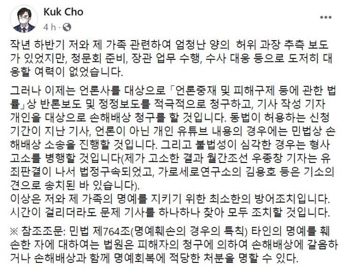▲ 조국 전 법무부 장관이 20일 자신의 페이스북에 "문제 기사를 하나하나 찾아 모두 조치할 것"이라며 밝힌 내용. [조국 전 장관 페이스북 캡처]