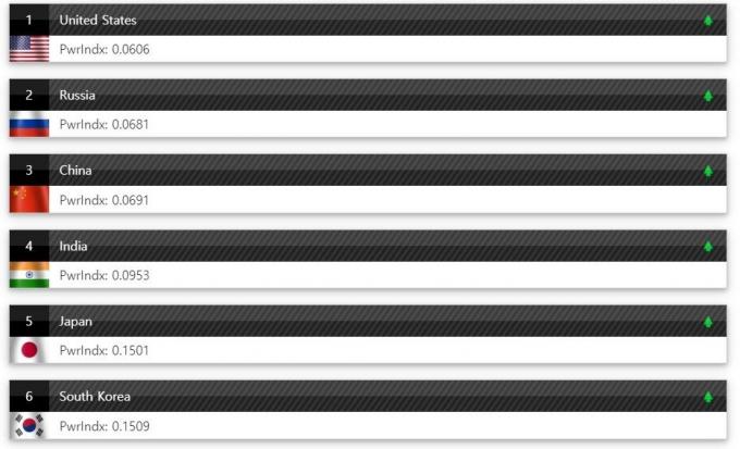 GFP는 인구와 병력, 국방예산, 무기 수 등 50개 항목을 종합해 군사력 지수를 산출한다. 지수가 0에 근접할수록 군사력이 강하다는 뜻이다.