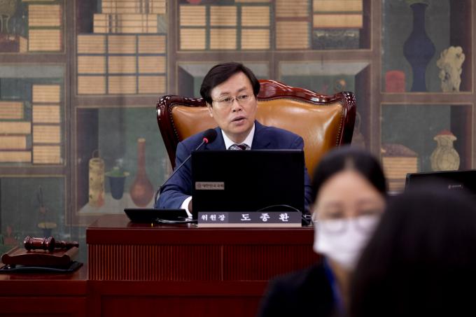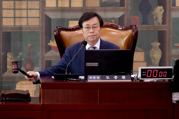 도종환 국회 문화체육관광위원회 위원장이 21일 서울 여의도 국회에서 열린 문체위 전체회의(안건심사)에서 '철인3종경기 선수 가혹행위 및 체육 분야 인권침해' 청문회 증인 동행명령장 발부의 건을 상정하고 있다.