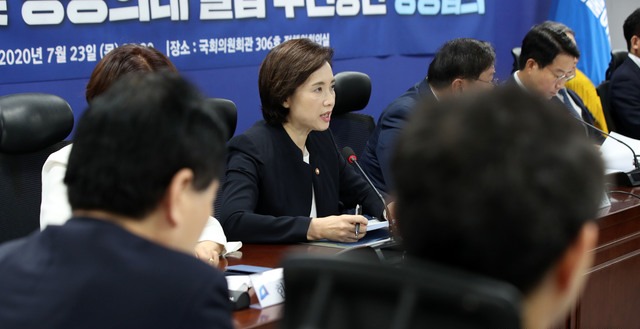 ▲ 유은혜 사회부총리 겸 교육부장관이 23일 오전 서울 여의도 국회에서 열린 더불어민주당 공공의료 인력 확충을 위한 의대정원 확대 및 공공의대 설립 추진방안 당정협의에서 발언하고 있다. [뉴시스]