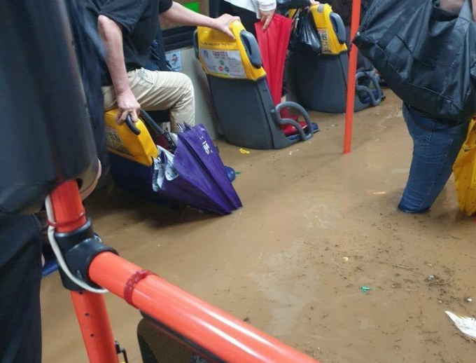▲ 23일 부산 한 버스에 도로 침수로 물이 차올라 있다. [인터넷 커뮤니티 캡처]