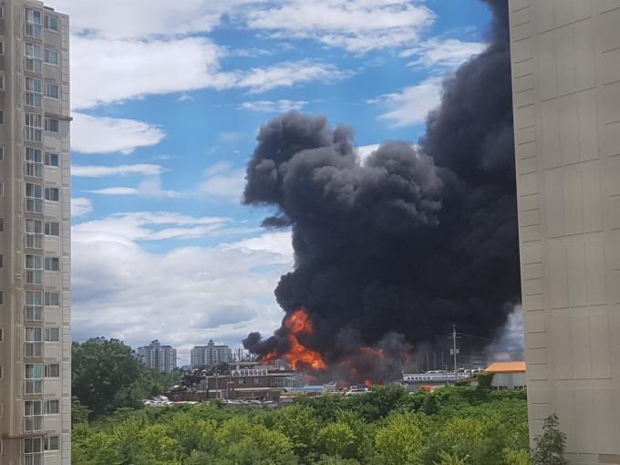 ▲ 25일 낮 화재가 발생한 경기 고양시 일산서구 덕이동 한 자동차 폐차장에서 불길과 검은 연기가 치솟고 있다. [독자 제보]