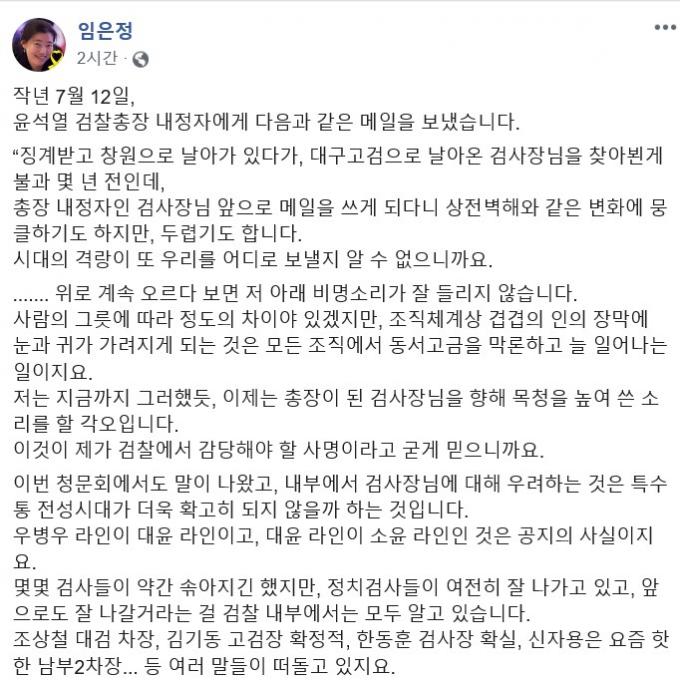 임 부장검사는 27일 자신의 소셜미디어(SNS)에 "작년 7월 12일, 윤석열 검찰총장 내정자에게 다음과 같은 메일을 보냈다"며 건의 내용을 적었다.