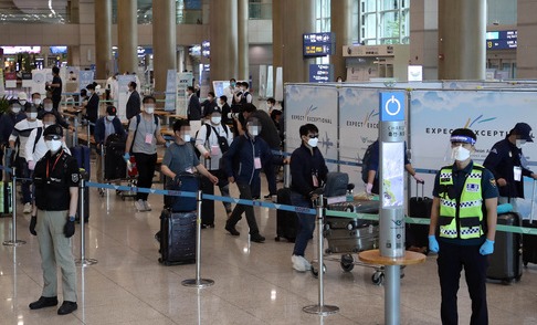 ▲ 지난 24일 오전 코로나19 악화로 정부가 급파한 공군 공중급유기(KC-330)를 타고 인천국제공항에 도착한 이라크 파견 근로자들이 입국장을 나서고 있다. [뉴시스]