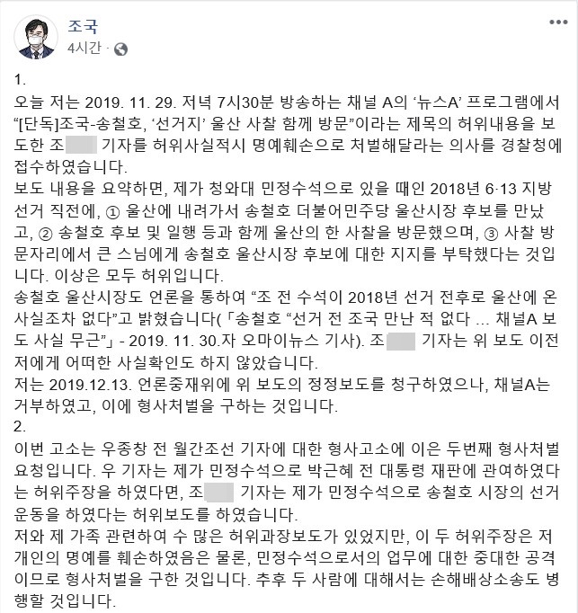 조 전 장관은 이날 자신의 소셜미디어(SNS)에 "지난해 11월 29일 채널A 뉴스A 프로그램에서 '[단독]조국-송철호, 선거지 울산사찰 함께 방문'이라는 제목의 허위내용을 보도한 조모 기자를 허위사실적시 명예훼손으로 처벌해 달라는 의사를 경찰청에 접수했다"고 적었다