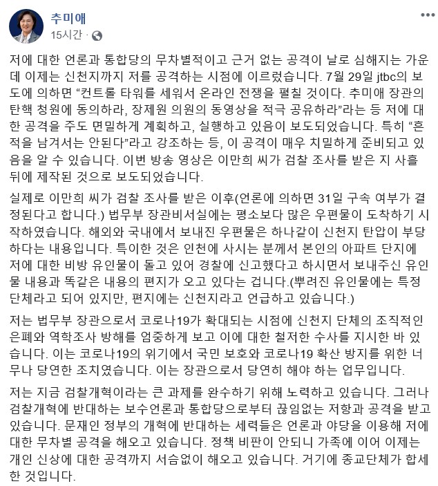 추 장관은 31일 자신의 소셜미디어(SNS)에 올린 글을 통해 "저에 대한 언론과 (미래)통합당의 무차별적이고 근거 없는 공격이 날로 심해지는 가운데 이제는 신천지까지 저를 공격하는 시점에 이르렀다"며 이같이 밝혔다.