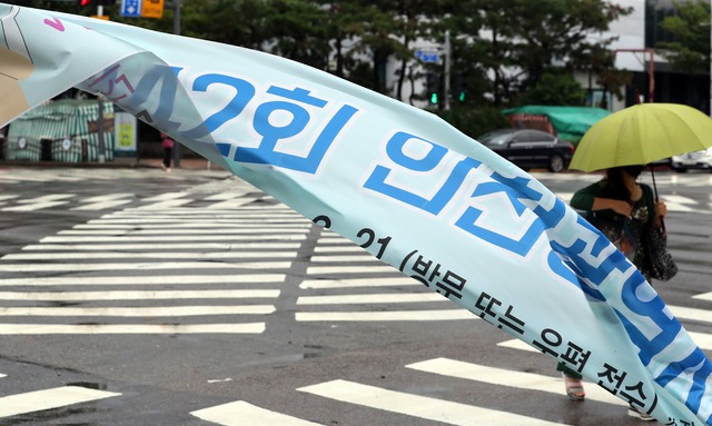 ▲ 지난 3일 오전 인천시 미추홀구 터미널사거리에서 시민이 우산을 쓰고 폭우를 동반한 강풍으로 떨어진 현수막옆을 지나가고 있다. [뉴시스]