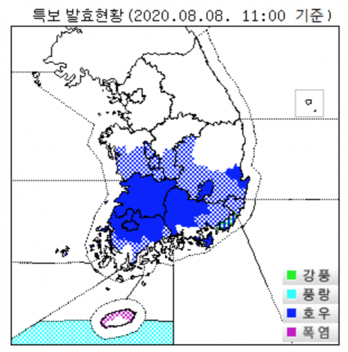 기상청에 따르면 현재 전라도 지역에 돌풍과 천둥, 번개를 동반한 시간당 30~60mm의 매우 강한 비가 내리고 있다. 경북과 경남서부, 충청에는 시간당 10~30mm의 강한 비가 오는 곳이 있다.
