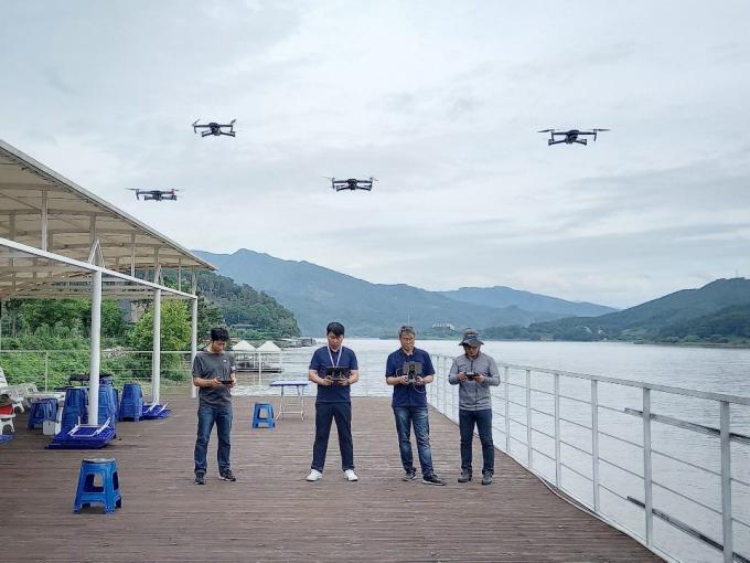 ▲ 의암댐 선박 전복사고 실종자 수색을 위해 출동한 안산시 드론봉사대가 드론을 띄우고 있다. [안산시 제공}