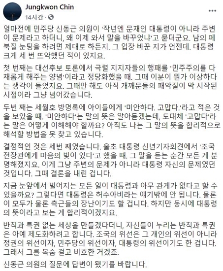 진 전 교수는 8일 자신의 페이스북에 글을 올려 "문 대통령에게 크게 세 번 뜨악했던 적이 있다"고 밝혔다. 이는 앞서 신동근 더불어민주당 의원이 "지난해에는 문 대통령이 아니라 주변이 문제라고 하더니 왜 이제 와서 말을 바꾸냐"고 한 질문에 대한 답이다.
