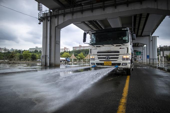 ▲ 장기간 이어진 장마로 올라갔던 한강의 수위가 내려간 13일 오후 서울 서초구 반포한강공원 잠수교 일대에서 작업자들이 청소 및 복구 작업을 하고 있다. [정병혁 기자]