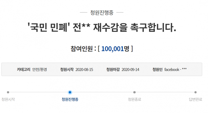 청와대 국민청원 게시판에 따르면 전날 올라온 '국민민폐 전광훈의 재수감을 촉구한다'는 글은 이날 오후 3시 기준 10만 명의 동의를 받았다.