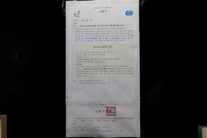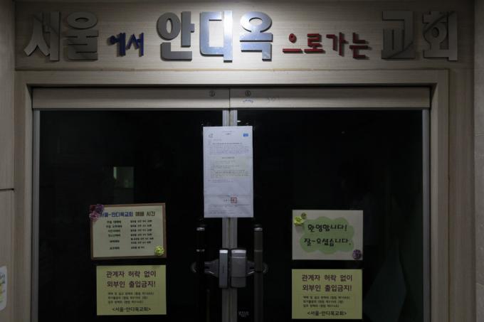 사랑제일교회 발(發) 코로나19 n차 감염이 지속되고 있는 19일 오전 총 18명의 코로나19 확진자가 발생한 서울 노원구 안디옥교회에 집합 제한명령문이 붙어있다.