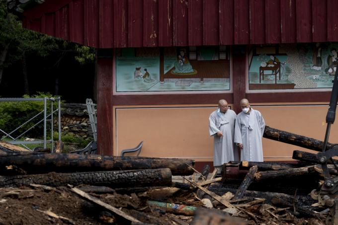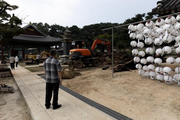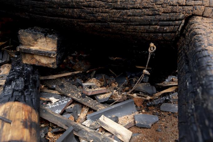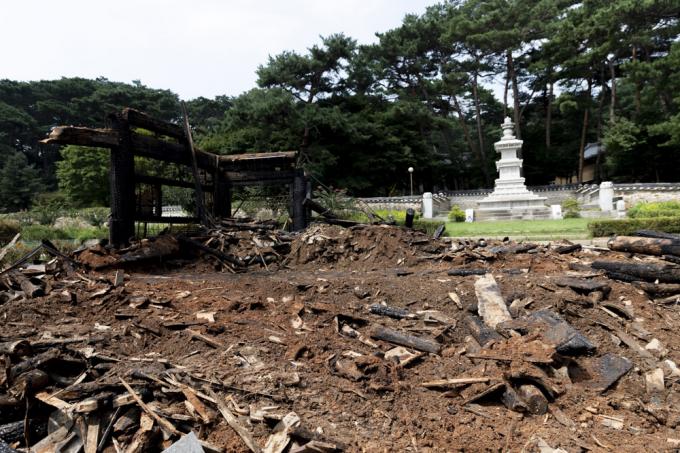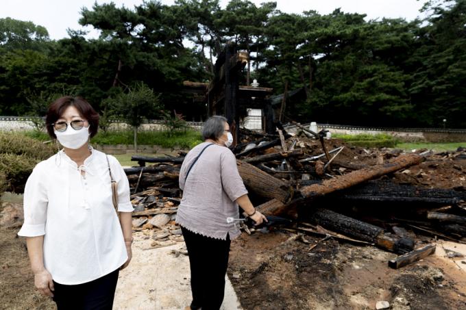 20일 오후 화재로 전소된 경기 화성 용주사 호성전 앞에서 시민들이 타버린 잔해를 보고 있다. 이날 오전 1시 10분경 발생한 화재로 전소된 호성전에는 정조대왕, 사도세자, 경의왕후(혜경궁 홍씨), 효의왕후 김씨(정조의 비)의 위패가 모셔져 있었다. 문화재청에 따르면 이중 정조대왕의 위패는 축소 복제품으로 진품은 현재 불교중앙박물관에 보관돼 있다고 밝혔다.