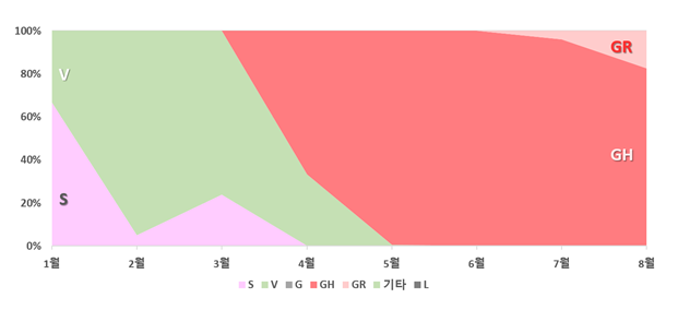 GH그룹은 경북 예천과 이태원 클럽 사례부터 주로 검출되고 있다. 이 그룹은 전파력이 S나 V그룹보다 6배 가량 높은 것으로 알려졌다.