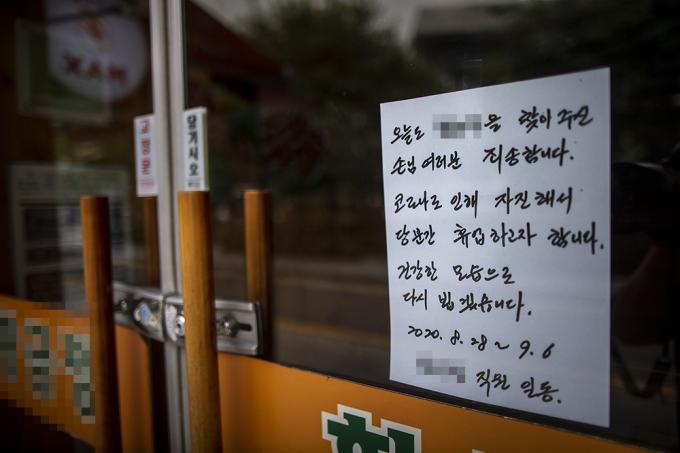수도권을 중심으로 코로나19가 재확산하며 사회적 거리두기 2.5단계가 시행되는 등 시민들의 소비 활동에 제한이 걸리면서 자영업자들의 고통이 늘어나고 있는 31일 오후 서울 종로구의 한 음식점에 휴업 안내문이 붙어있다.