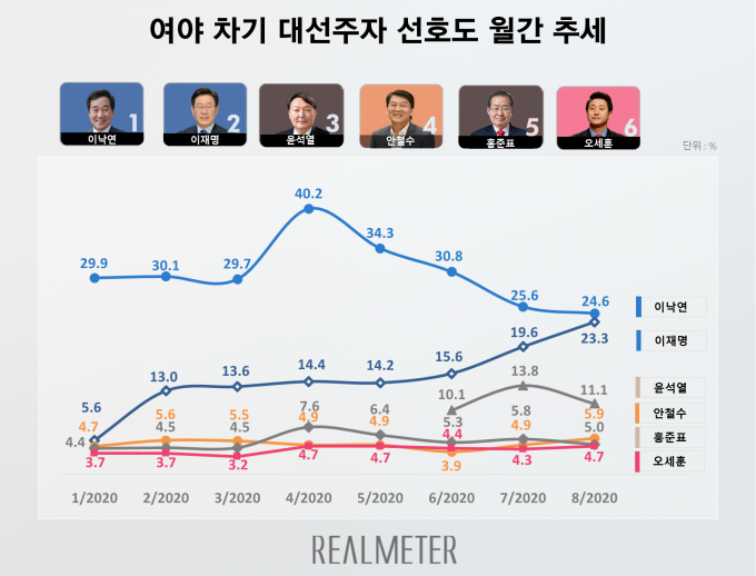 오마이뉴스 의뢰로 리얼미터가 8월24∼28일 전국 성인 2544명을 대상으로 조사한 결과 이 대표에 대한 선호도는 전월보다 1.0%p 내린 24.6%로 조사됐다. 4개월 연속 하락이다.