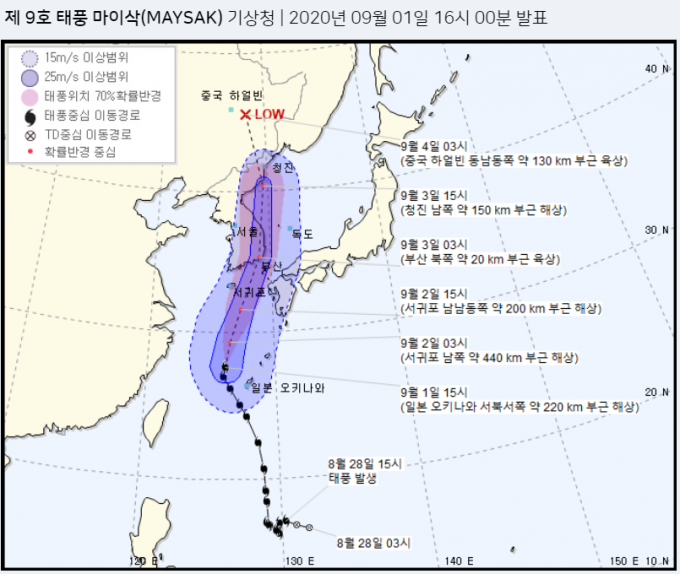 기상청 우진규 예보분석관은 "마이삭은 3일 오전 3시께 경남 해안 부근에 상륙할 가능성이 가장 크다"며 "구체적인 지점은 거제와 부산 사이 정도로 예측하나 북상 과정에서 주변 환경에 따라 달라질 수 있다"고 설명했다.
