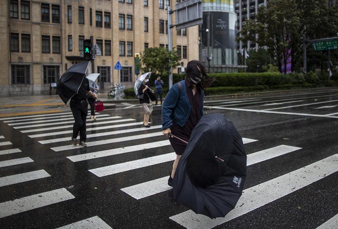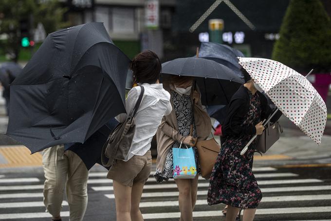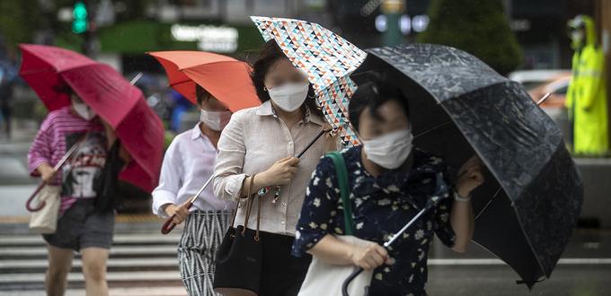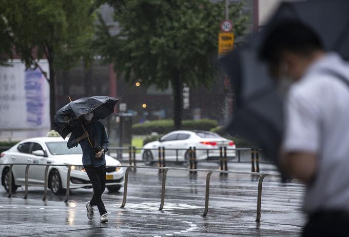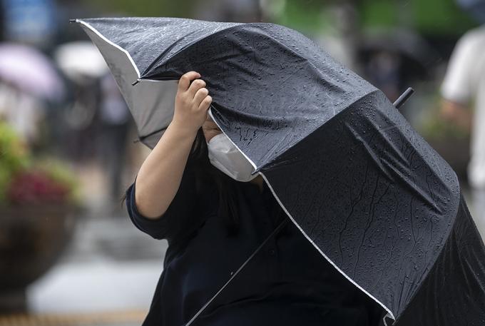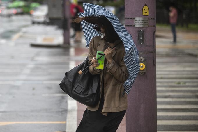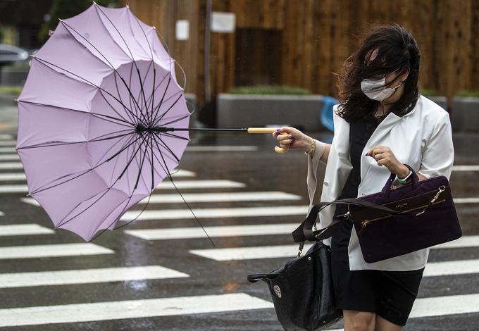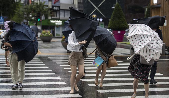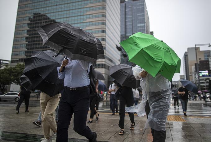 9호 태풍 마이삭이 북상 중인 3일 오전 서울 종로구에 거센 바람이 불고 있다. 비까지 내려 시민들이 우산을 쓰고 있지만 강풍 탓에 우산이 뒤집히는 듯 속수무책이다.
