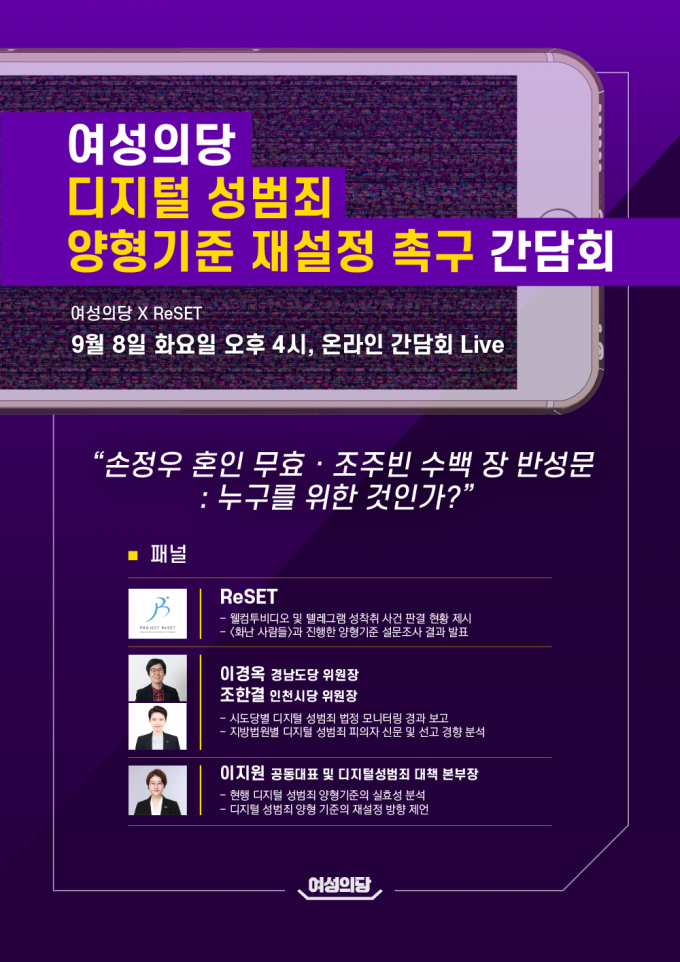오는 14일 양형위원회의 기준 결정에 국민 감정 반영해야 여성의당과 텔레그램 성 착취 고발 프로젝트팀 리셋(ReSET)이 오는 8일 '디지털성범죄 양형기준 재설정'을 촉구하기 위한 온라인 간담회를 연다. 성범죄자들의 양형기준 악용을 막는다는 취지다. 아울러 국민 법 감정과 맞는 양형기준 설정의 필요성을 지적할 예정이다.